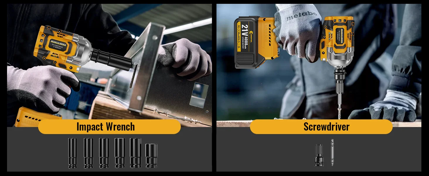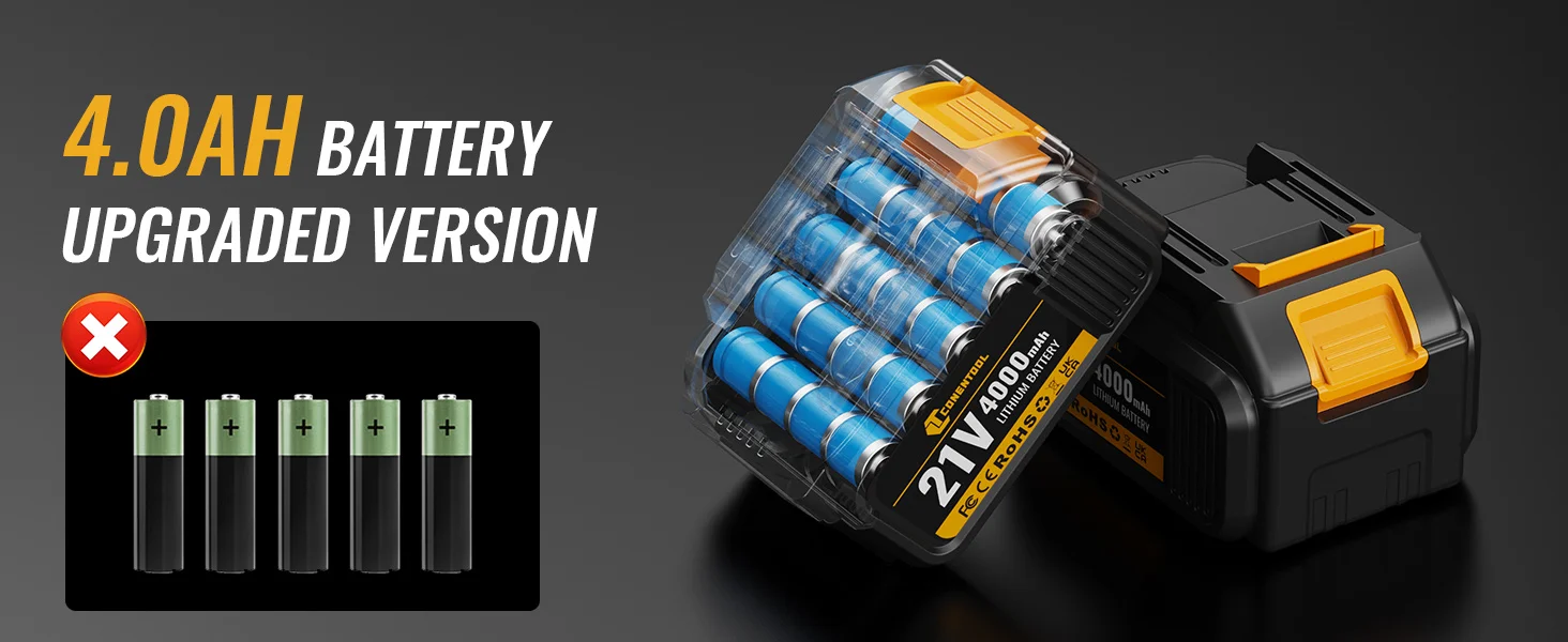 【4.0 Ah battery & quick charger】We understand the importance of battery life. Our cordless impact wrench comes with 2x4.0Ah impact wrench batteries, as well as a quick charger. Compared to other 3.0Ah batteries, it enjoys over 100% longer life. No more frequent recharging - get a CONENTOOL impact wrench and increase your work performance.
