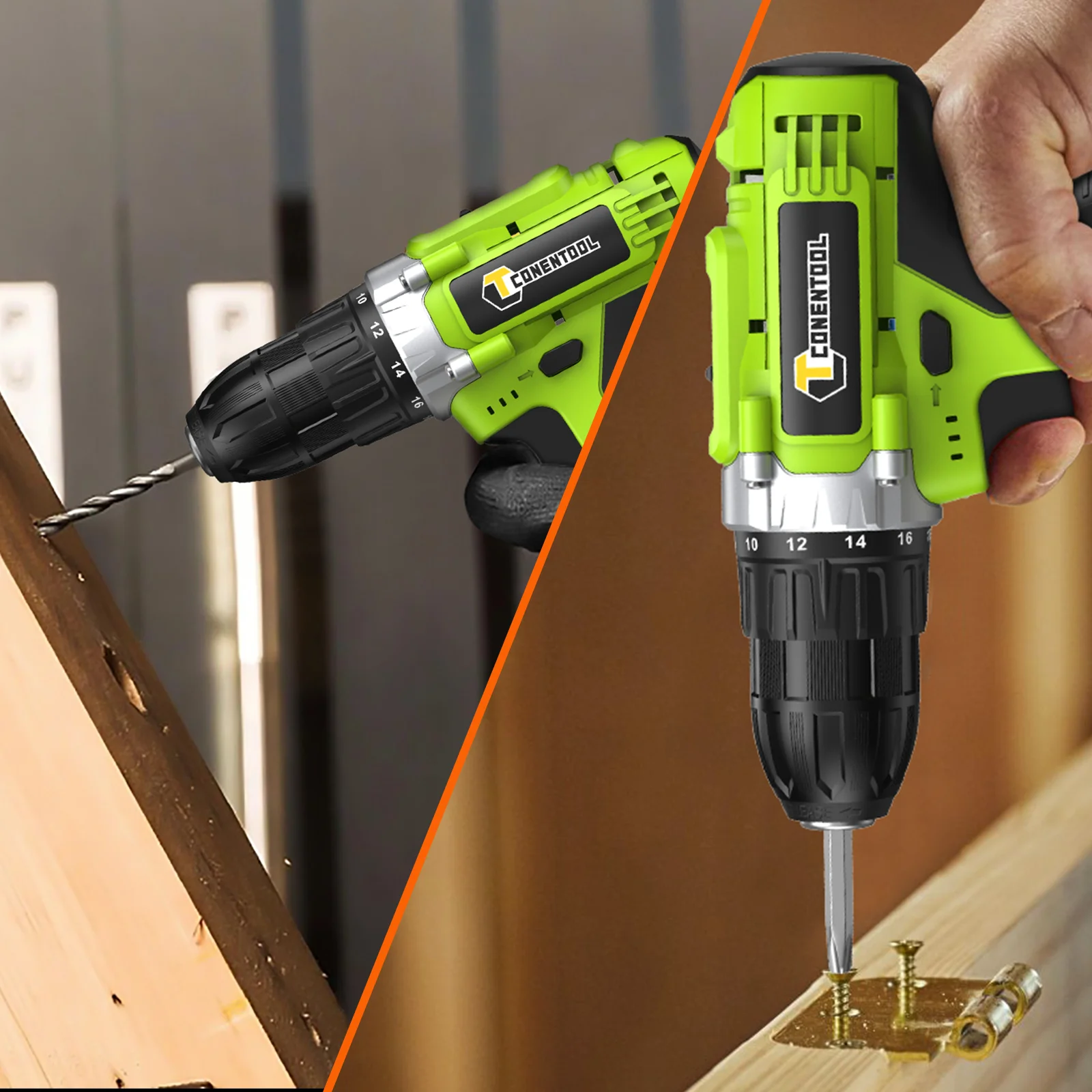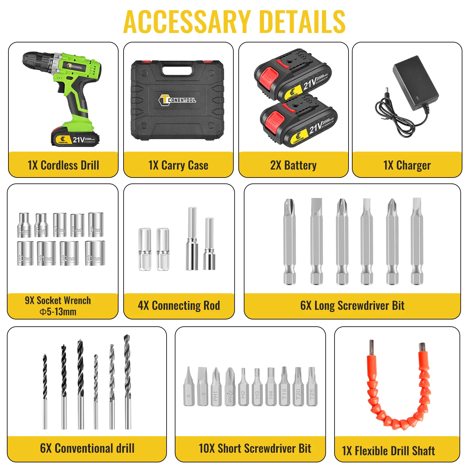 CONENTOOL 21V Cordless Drill Driver 25+1 Torque 45Nm 2 Speed 36PCS