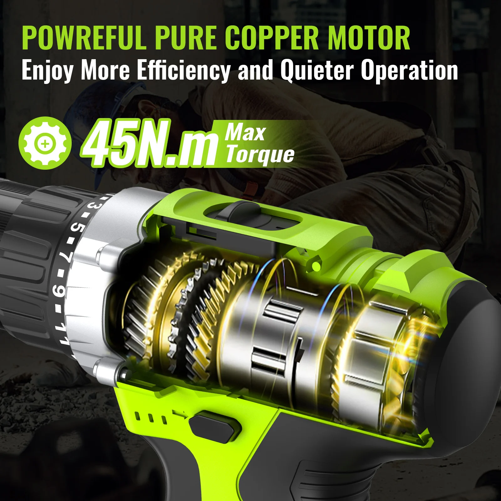 The 48V cordless drill features a high-performance pure copper motor, delivering up to 45Nm of maximum torque. Effortlessly tackle a variety of tasks, from drilling ceramic tiles and thin metal sheets to wood and precise screw-driving operations.