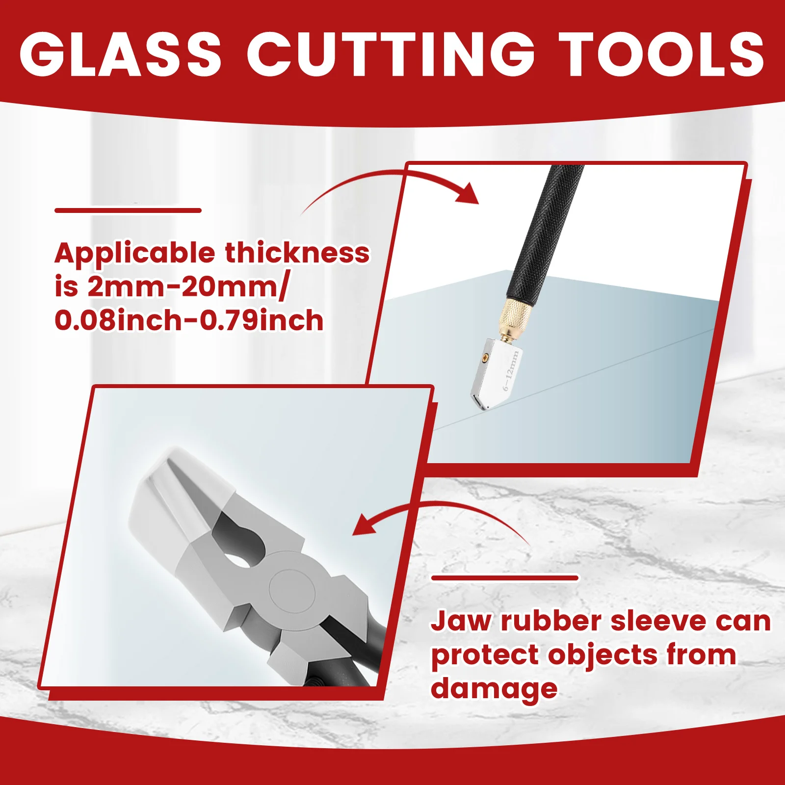 Glass Running and Breaking Pliers: These two types of pliers, both made of steel, feature soft red PVC cushioned handles for a comfortable grip. The glass running pliers have a curved jaw rubber sleeve to protect objects from damage, and the adjustable fixing screw design allows you to precisely control the clamping force and size